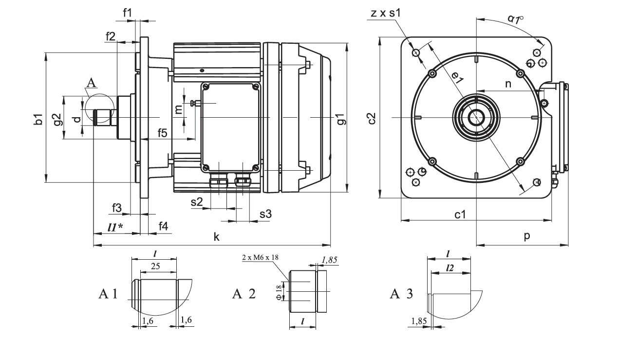 Важно: Размер I₁ указан в рабочем (расторможенном) положении. В покое вал выступает на 1.5–2.5 мм больше.