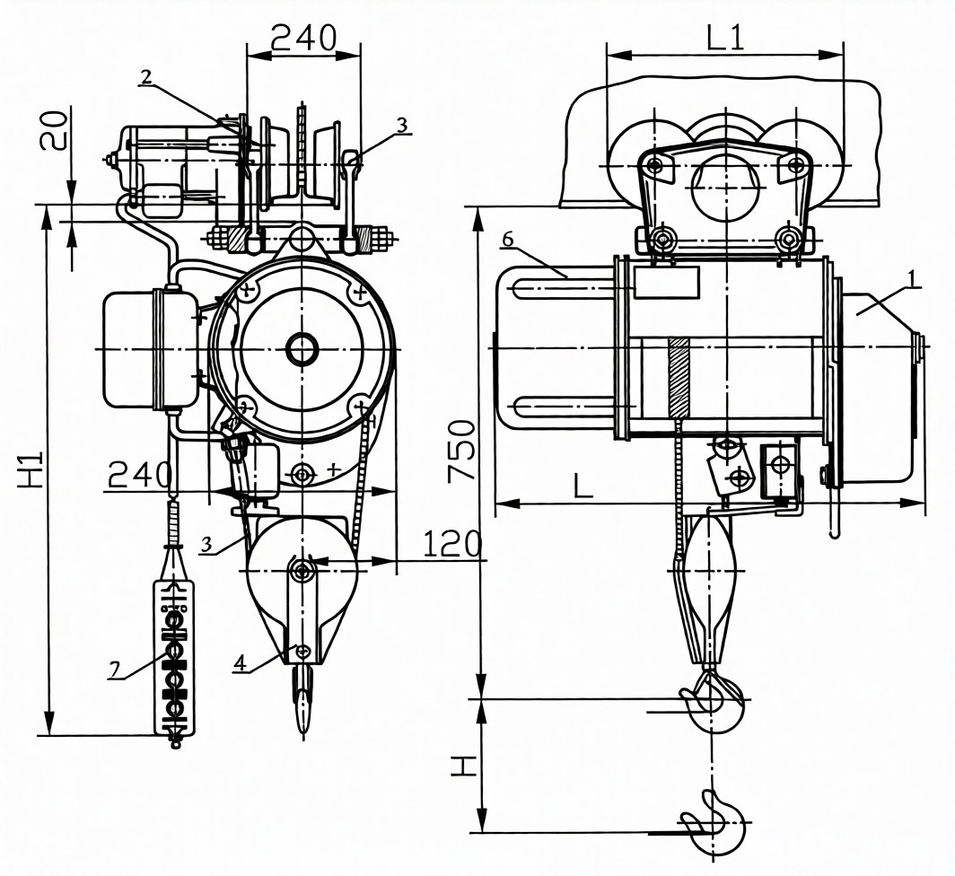 Тормозная система: Нормально-замкнутый тормоз автоматически срабатывает при отключении питания, надежно удерживая груз на весу.